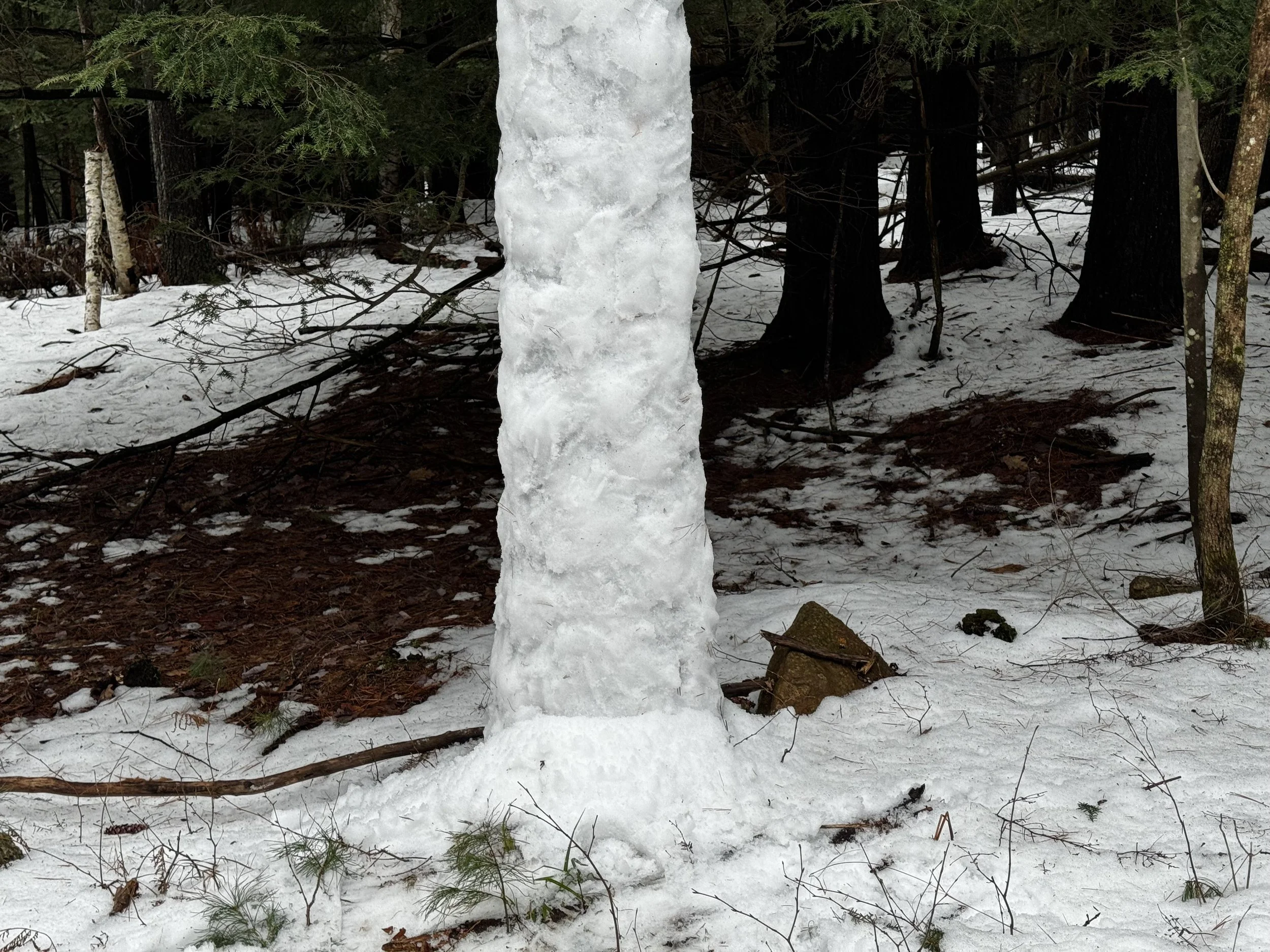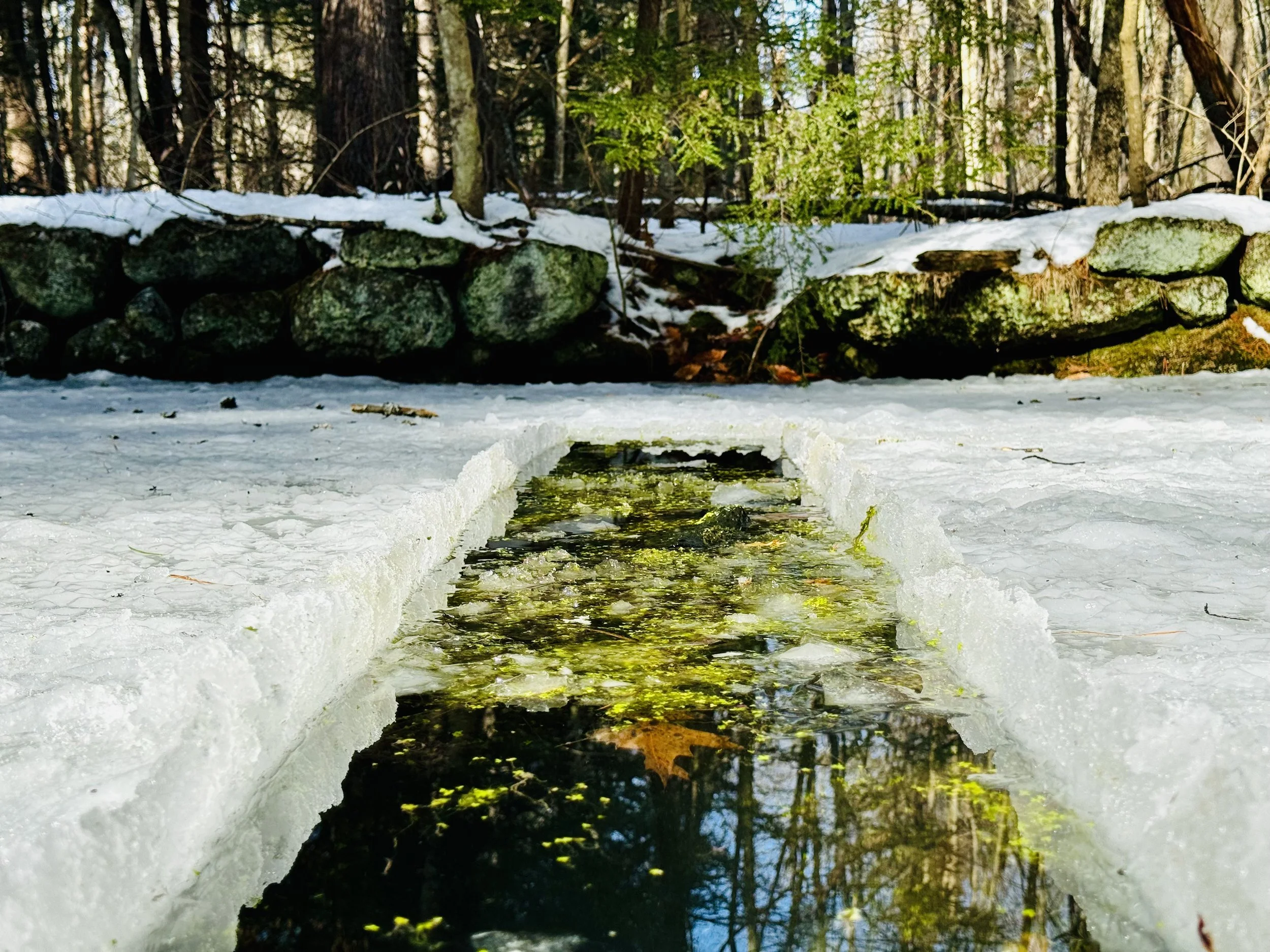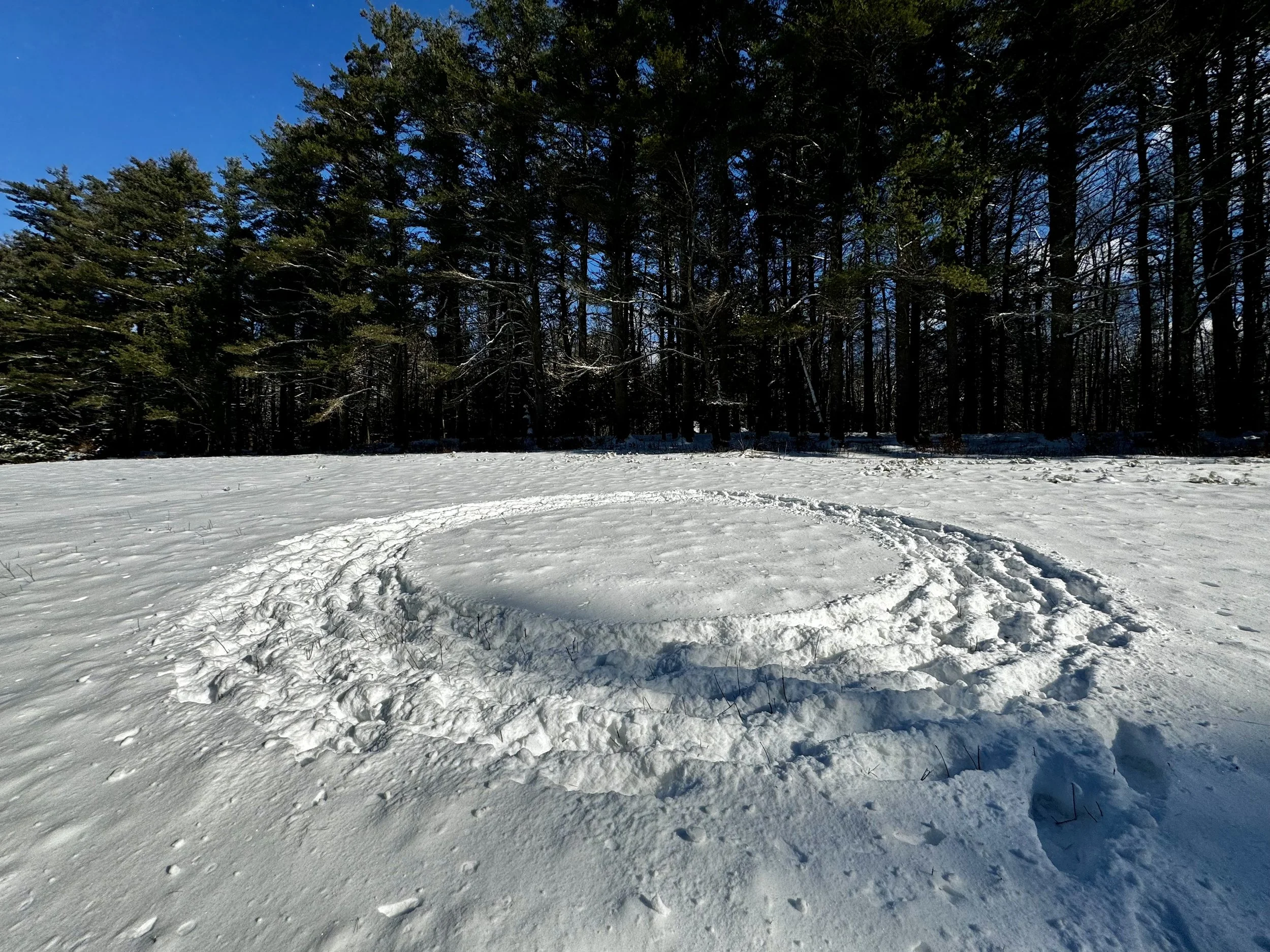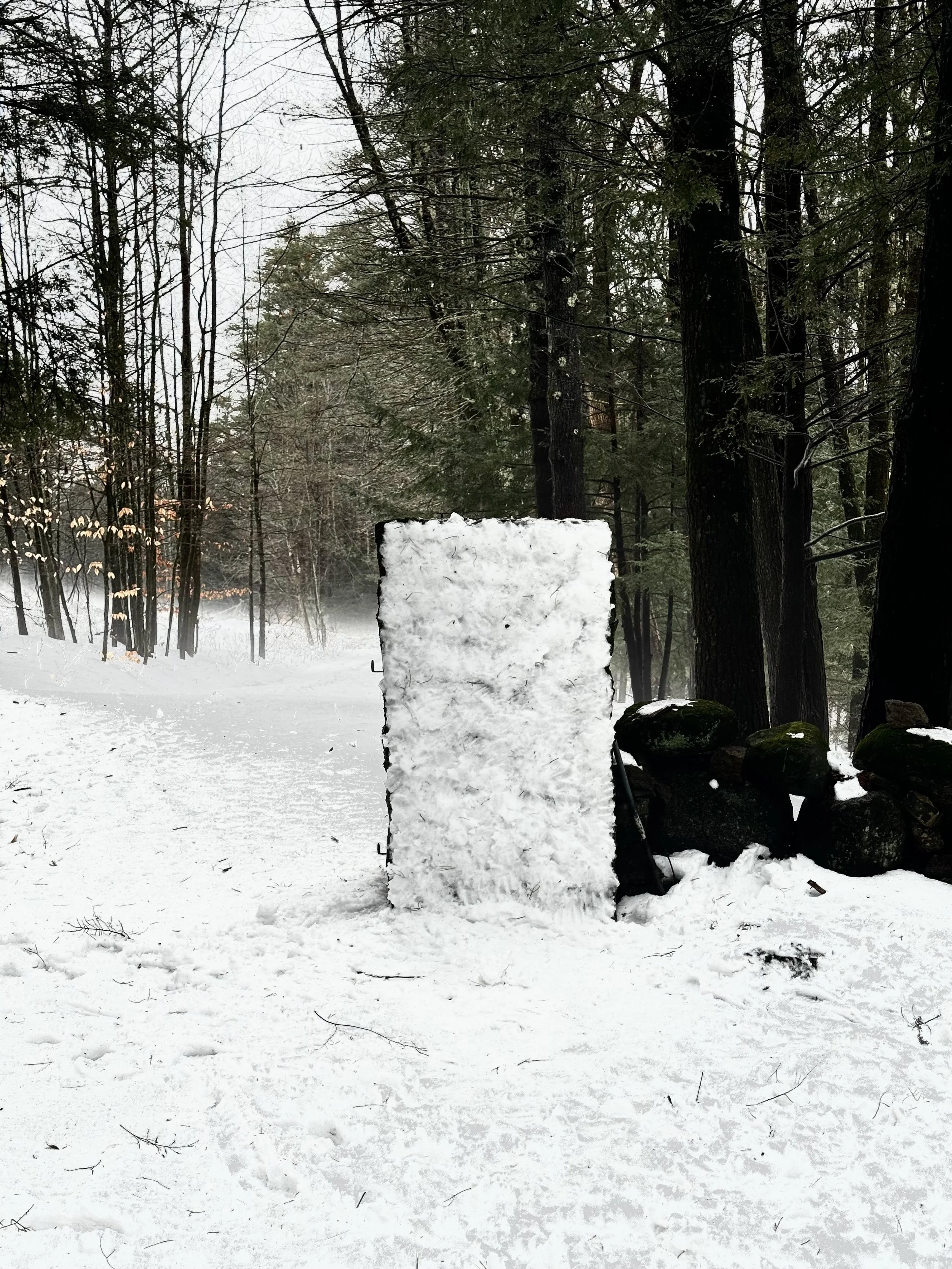 This installation produced on the fire pond during a MacDowell Residency, was produced using an ice spud and Finnish Ice Saw. The piece references the work of Gordon Matta Clark and also serves as a datum for meterological conditions. As the ice freezes and thaws, the piece exhibits a range of appearances. Ultimately, the piece is completely erased as the Spring weather approaches.